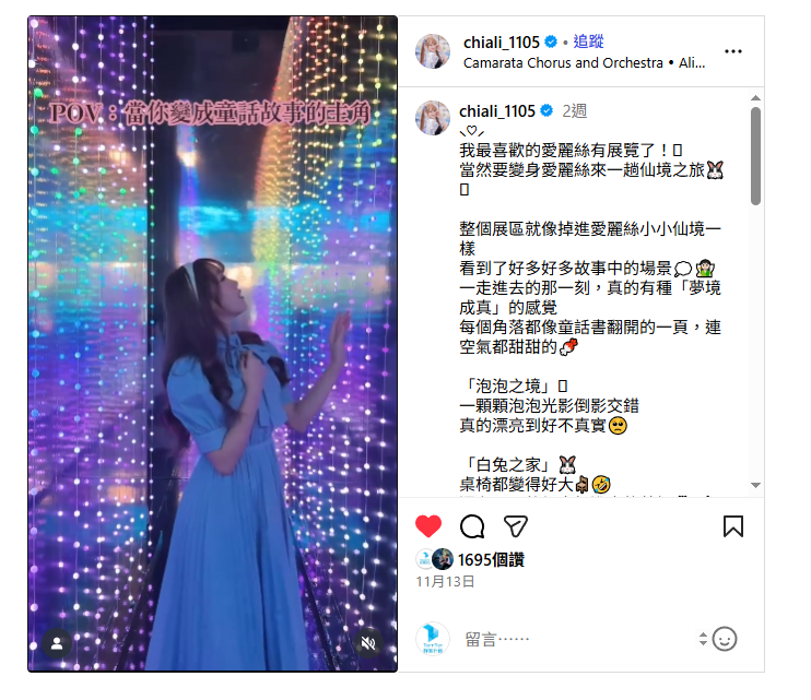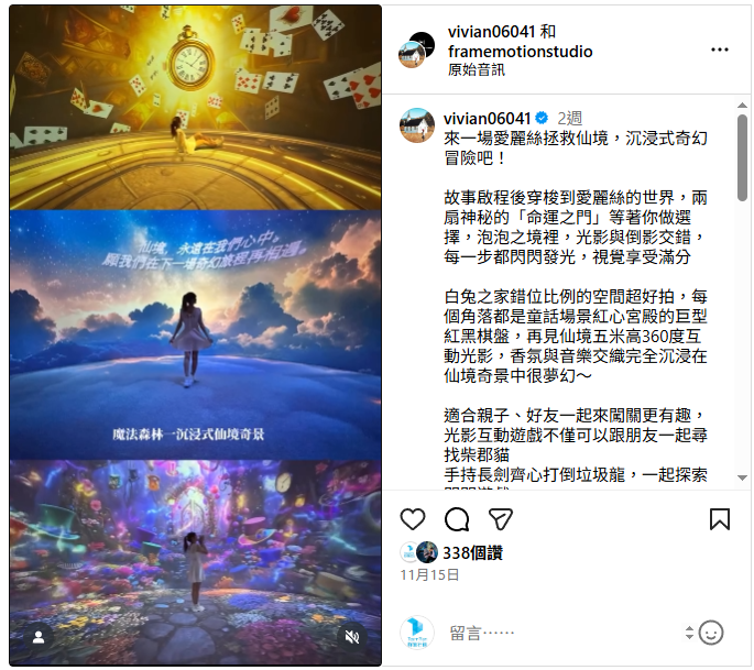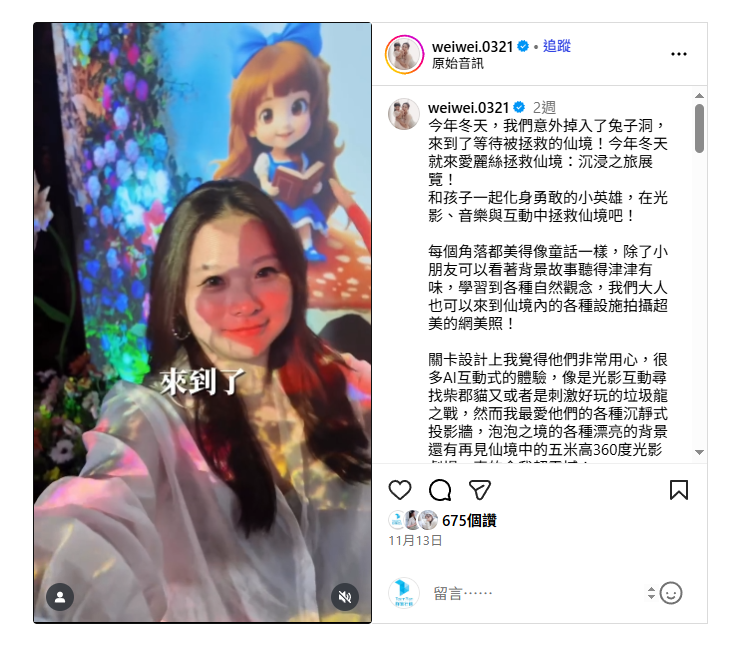 自 11 月 8 日開展以來,台北微風廣場就被一股「夢幻粉紫風暴」席捲!全台首座結合光影、AI 與香氛的**《愛麗絲拯救仙境:沉浸之旅-台北站》**,不僅在 IG 上掀起打卡熱潮,更吸引了多位創作者爭相朝聖。展覽好評持續延燒,被譽為今年冬天「最殺手機記憶體」與「最有沉浸感」的必訪景點,展期將一路持續至 2026 年 1 月 25 日。